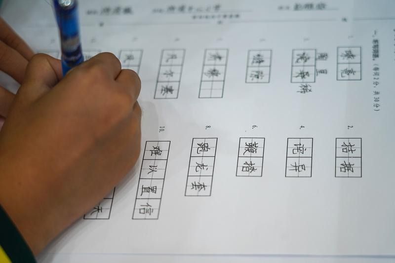 比賽設置三個環(huán)節(jié),分別為聽詞寫字、聽詞語釋義寫字及聽古詩詞寫詩句。上午9時10分,比賽正式開始,臺下瞬間陷入緊張的氛圍中。每當臺上出題老師念出題目,學生們便立刻雙眼緊鎖卷面,手中的筆懸在半空,待確認字音后,隨即俯身“唰唰”疾書;遇到熟悉的詩句時,不少人下筆果斷流暢,字跡舒展;而聽到生僻詞語的釋義時,又會微微歪頭思索,筆尖在草稿紙上輕輕勾畫、反復琢磨,專注的神態(tài)盡顯對每一個漢字的認真。