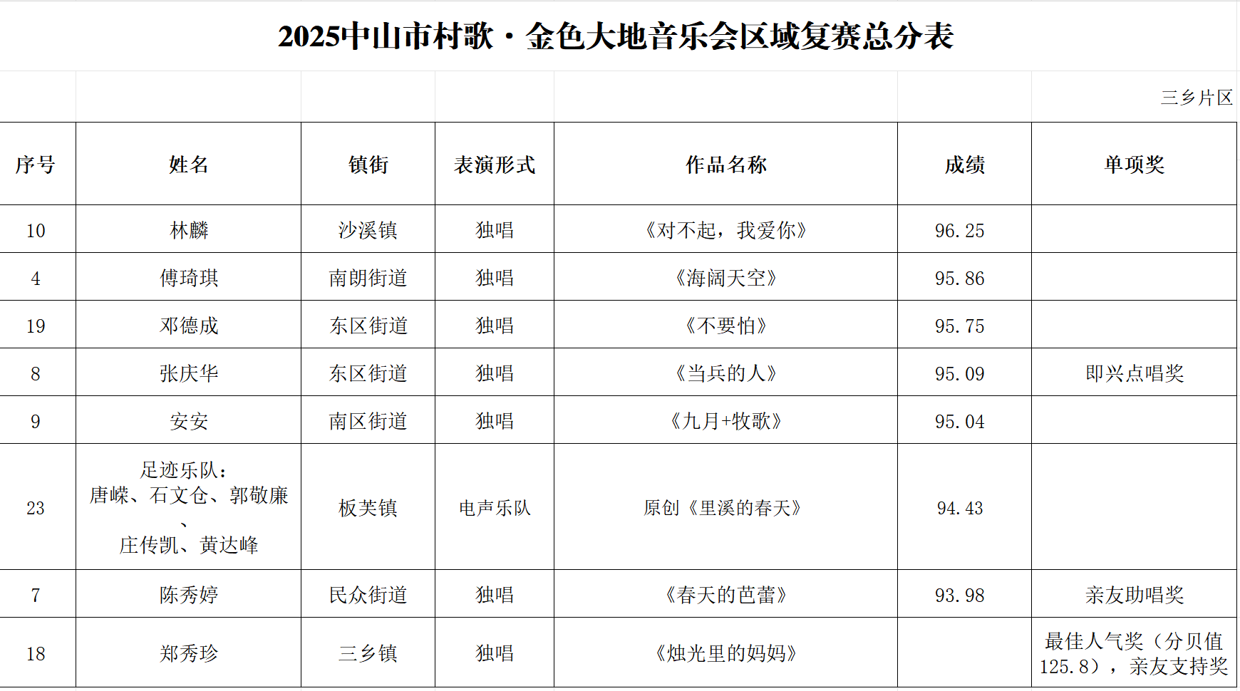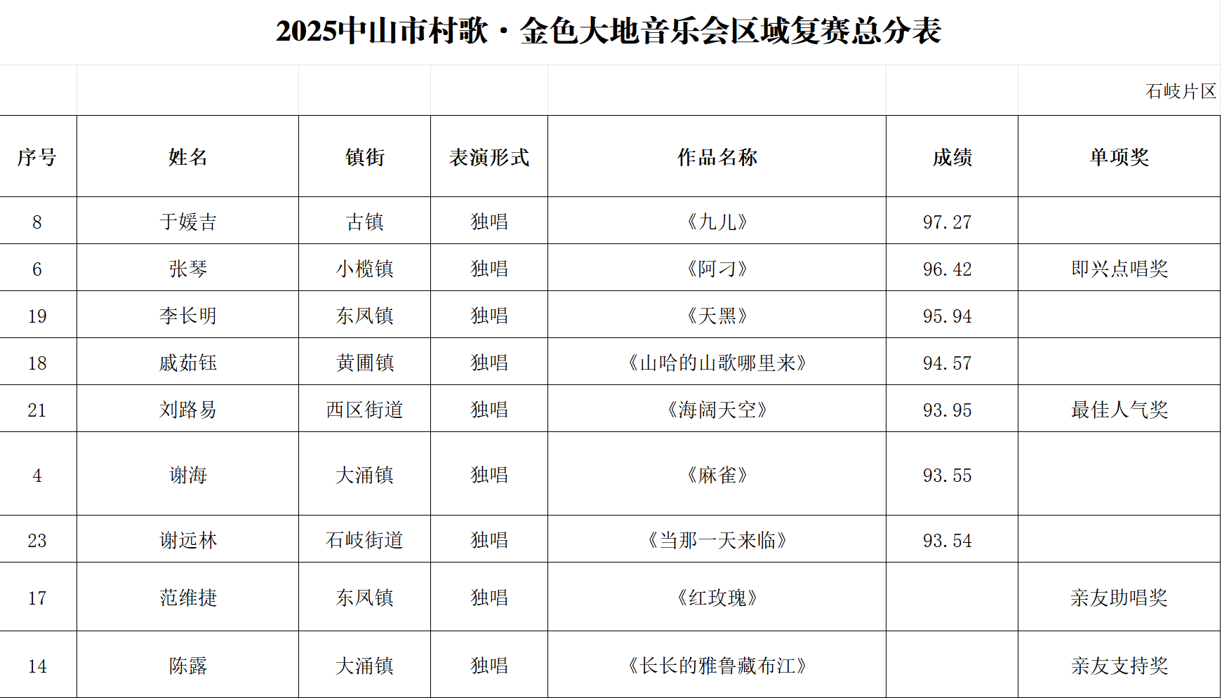 12月5日至6日,“2025中山市村歌·金色大地音樂會”三鄉(xiāng)、石岐兩場區(qū)域復賽相繼火熱落幕。來自全市23個鎮(zhèn)街的46組民間歌唱愛好者同臺競技,以歌為媒講述鄉(xiāng)土故事、抒發(fā)家國情懷,最終14組實力選手脫穎而出,成功晉級12月13日在大涌鎮(zhèn)紅木文化博覽城舉辦的市級決賽。