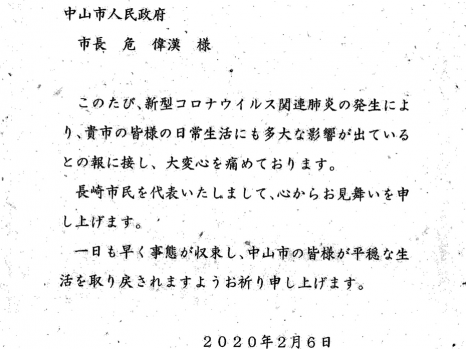 長(zhǎng)崎市市長(zhǎng)田上富久致中山市的慰問信及譯文