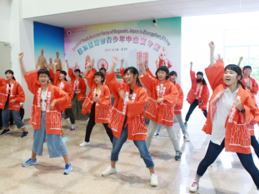 長(zhǎng)崎青少年在歡迎儀式上表演舞蹈