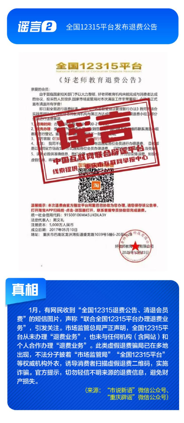 公共政策領(lǐng)域謠言誤導公眾決策?!吧绫?]有有效期限制、未到期不能換新卡”是對社??ü芾碚叩恼`讀,給民眾平添困擾;“28家博物館元旦期間閉館”實為少數(shù)博物館根據(jù)運營安排所做的微調(diào),網(wǎng)帖嚴重夸大實際閉館情況,引發(fā)負面炒作;“深圳有望推行12年義務教育,高中免費”是對現(xiàn)行政策的“超前編造”,誤導學生及家長群體;“全國12315平臺發(fā)布退費公告”,則是假冒監(jiān)管機構(gòu)名義散播不實通知,為后續(xù)詐騙行為做鋪墊。