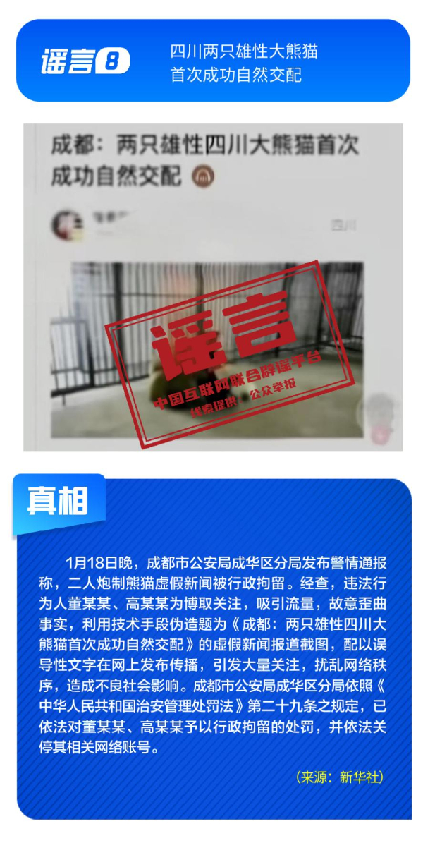 針對各類網(wǎng)絡謠言與亂象,多部門開展協(xié)同治理,聯(lián)動整治。1月16日,中央網(wǎng)信辦召開全國網(wǎng)絡辟謠聯(lián)動機制第三次全體會議,部署以辟謠工作新成效助力清朗網(wǎng)絡空間建設(shè)。中央網(wǎng)信辦聯(lián)合工業(yè)和信息化部等部門持續(xù)整治汽車行業(yè)網(wǎng)絡亂象,處置一批涉嫌挑動對立、炒作負面話題、違規(guī)測評的賬號;國家廣播電視總局開展“AI魔改”視頻專項治理,各平臺處置大量違規(guī)內(nèi)容。各地網(wǎng)信部門積極行動,陜西西安深入開展房地產(chǎn)領(lǐng)域網(wǎng)絡專項行動,處置散布樓市謠言的房產(chǎn)中介賬號,四川成都依法處置30余個惡意關(guān)聯(lián)地域、污名化城市的違規(guī)賬號。公安機關(guān)依法打擊造謠傳謠人員。擺拍“小女孩在學校跳蚤市場用50元淘到名酒”、利用AI偽造“假救護車非法轉(zhuǎn)運”、編造“兩只雄性四川大熊貓首次成功自然交配”等謠言的相關(guān)責任人已依法被予以行政處罰。